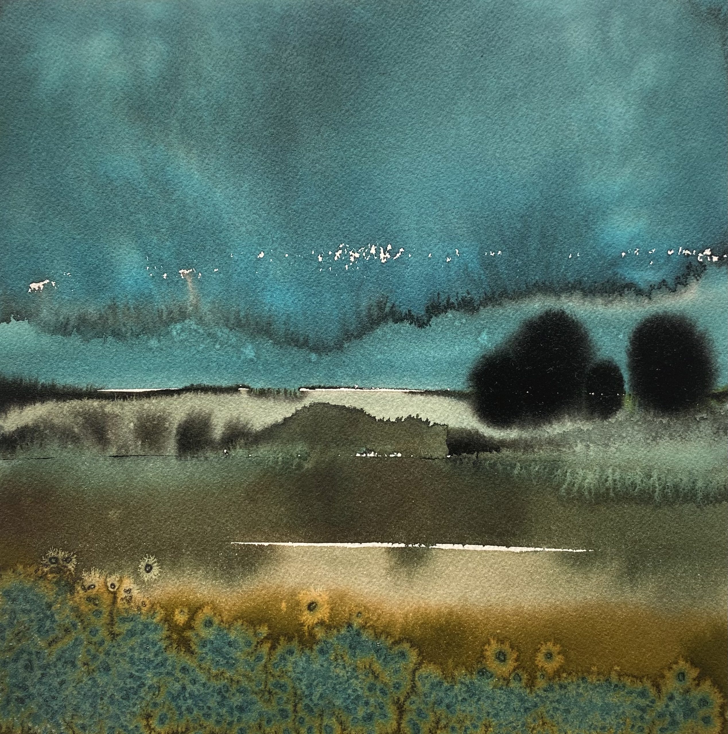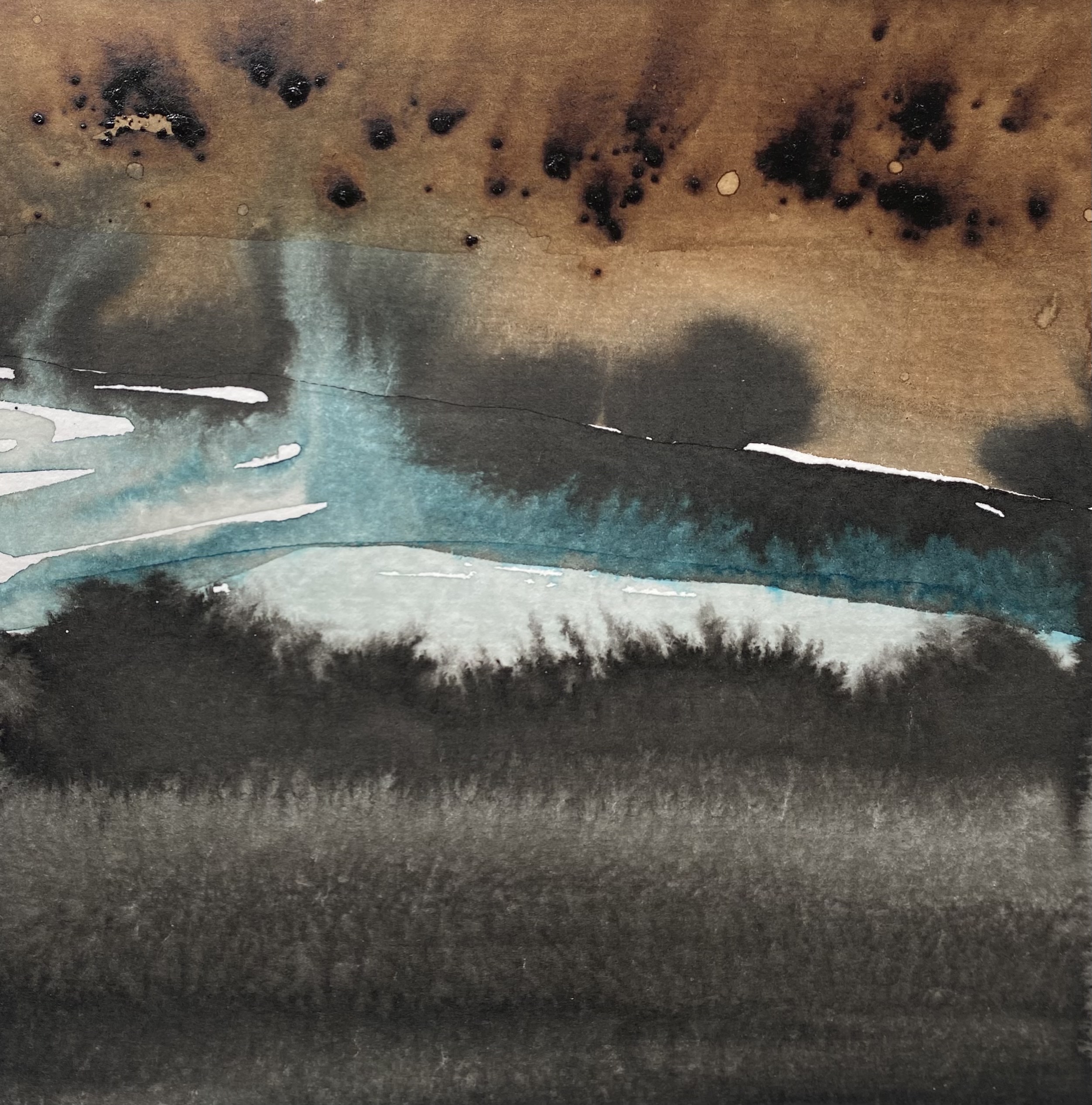 L’encre de Catherine Mainguy glisse sur le papier comme un souffle fragile, dessinant des horizons suspendus et des sillons où se mêlent fragilité et lumière.